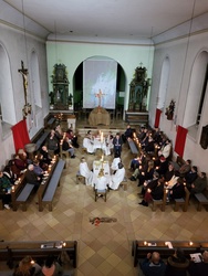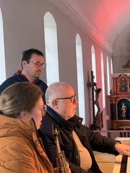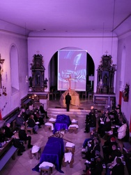 Vor allem geht es darum, Menschen für gottesdienstliches Geschehen zu begeistern, die, aus welchen Gründen auch immer, nicht mehr regelmäßig Gottesdienste besuchen, aber trotzdem interessiert sind an lebendigen Feiern des Glaubens. Mit einer Coronapause fanden nun diese Feiern, die auf Grundlage der Liturgiekarten des Bistums Würzburg gestaltet worden sind (https://liturgie.bistum-wuerzburg.de/downloads/liturgiekarten/ ) zum fünften Mal statt. Nachdem man in den ersten Jahren vor allem an verschiedenen Stationen im Freien, im Staatsbad Brückenau und in Wildflecken unterwegs war, fanden die diesjährigen Feiern in der Wallfahrtskirche auf dem Volkersberg und in der Kuratiekirche in Riedenberg statt. Die Initiative dazu gab in diesem Jahr Organist Steffen Link, der vor allem das Geschehen rund um Tod und Leben musikalisch vertiefen wollte. Im Dekanatskantor Markus Wollmann fand er gleich einen begeistern Mitarbeiter. Daraufhin wurde eine Vorbereitungsgruppe gegründet um diese Feiern menschennah und zeitgerecht vorzubereiten. Um Pastoralreferent Bernhard Hopf bildete sich so eine SprecherInnengruppe und eine Performancegruppe und versuchten Musik, Gestaltung und Texte in Einklang mit der Botschaft zu bringen.