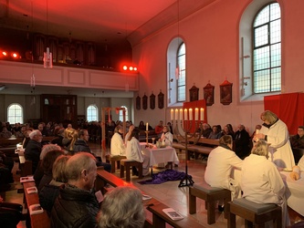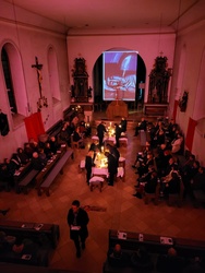 Die Botschaft, die so in neuen Zusammenhängen eine aktuelle Wirklichkeit bekam, wurde gefühlvoll durch die Organisten und die Saxophonistin Carolin Klug-Schäfer interpretiert. Zur Musik oder aber auch in Stille brachte die Performancegruppe aus dem Pastoralen Raum Bad Brückenau unter der Leitung von Susanne Raab das Gehörte auf die Bühne einer beeindruckenden visuellen Wahrnehmung. Somit waren alle Sinne angesprochen und es kam zu neuen Begegnungen mit der Geschichte Gottes tief im Innern der Menschen und wurde so zu einem großartigen Erlebnis.