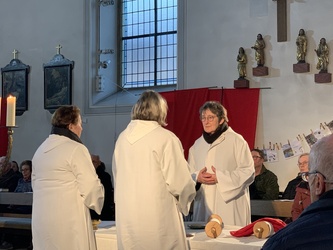 So blieben manche gesprochene Texte durch ihre starken Betonungen im Gedächtnis der Zuhörer. Die Musik hüllte wie ein Kleid, das Gehörte ein und brachte so auch noch neue Nuancen zum klingen. Einzelne Szenen und Skulpturen der Performance Gruppe brachten die Botschaft meditativ in die visuelle Dimension, so dass daraus eine lange Erinnerung wachsen konnte. Die Mitfeiernden wurden wirklich in das Geschehen mit hinein genommen.