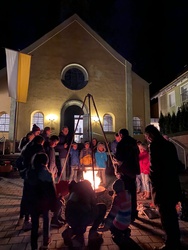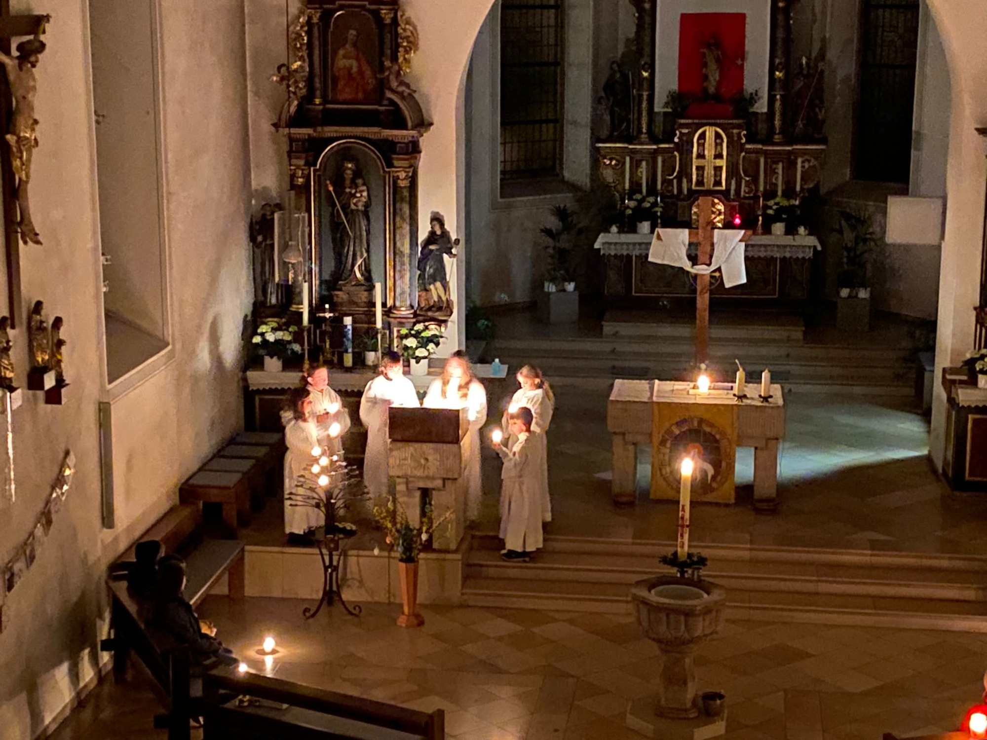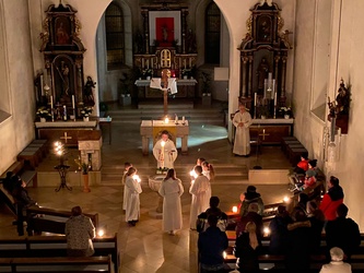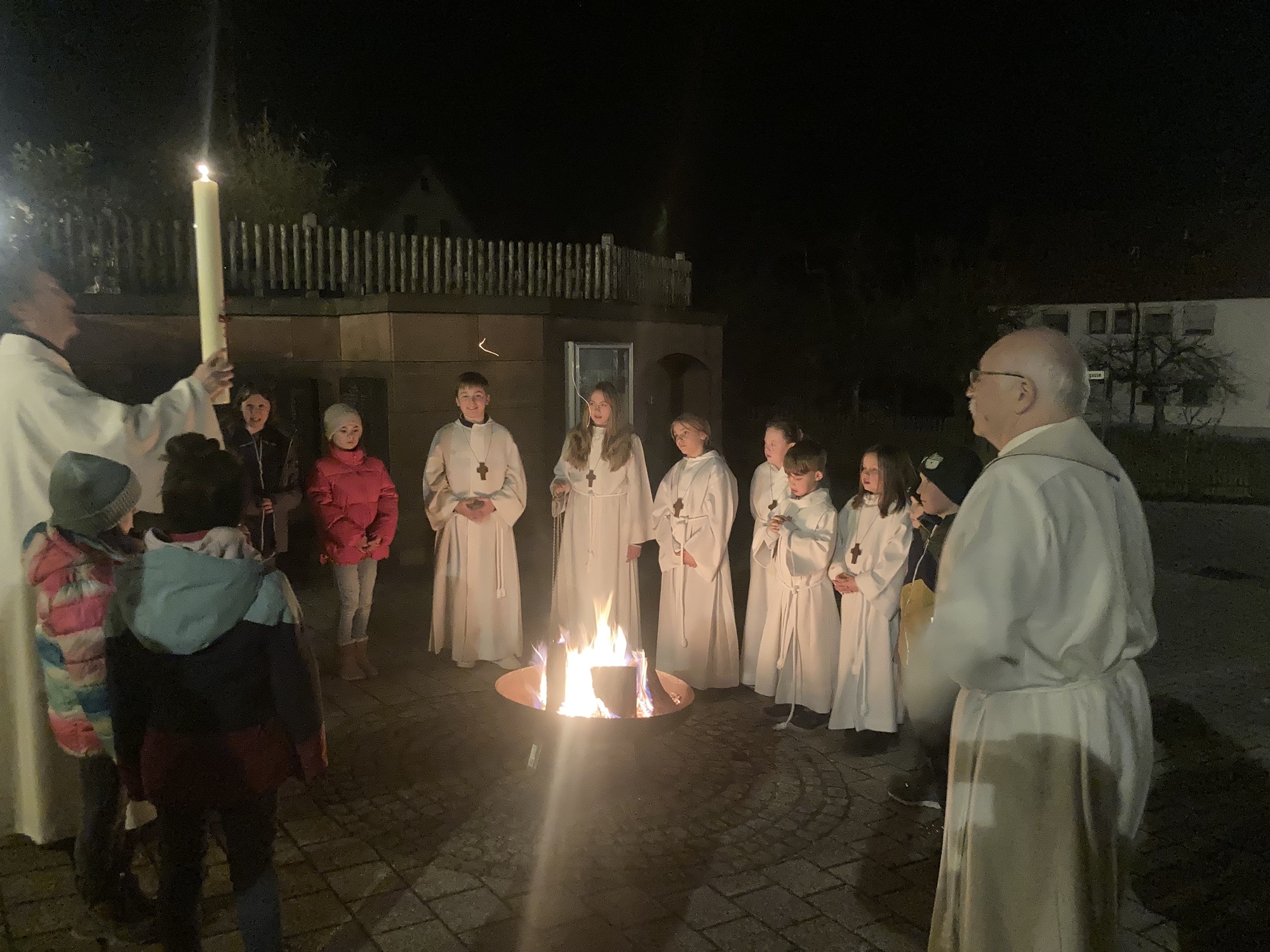 Auf den Fotos außerdem zu sehen sind die Ministranten bei ihrem Lichtertanz und der Gestaltung der 1. Lesung (Schöpfungsgeschichte) in der Osternacht.