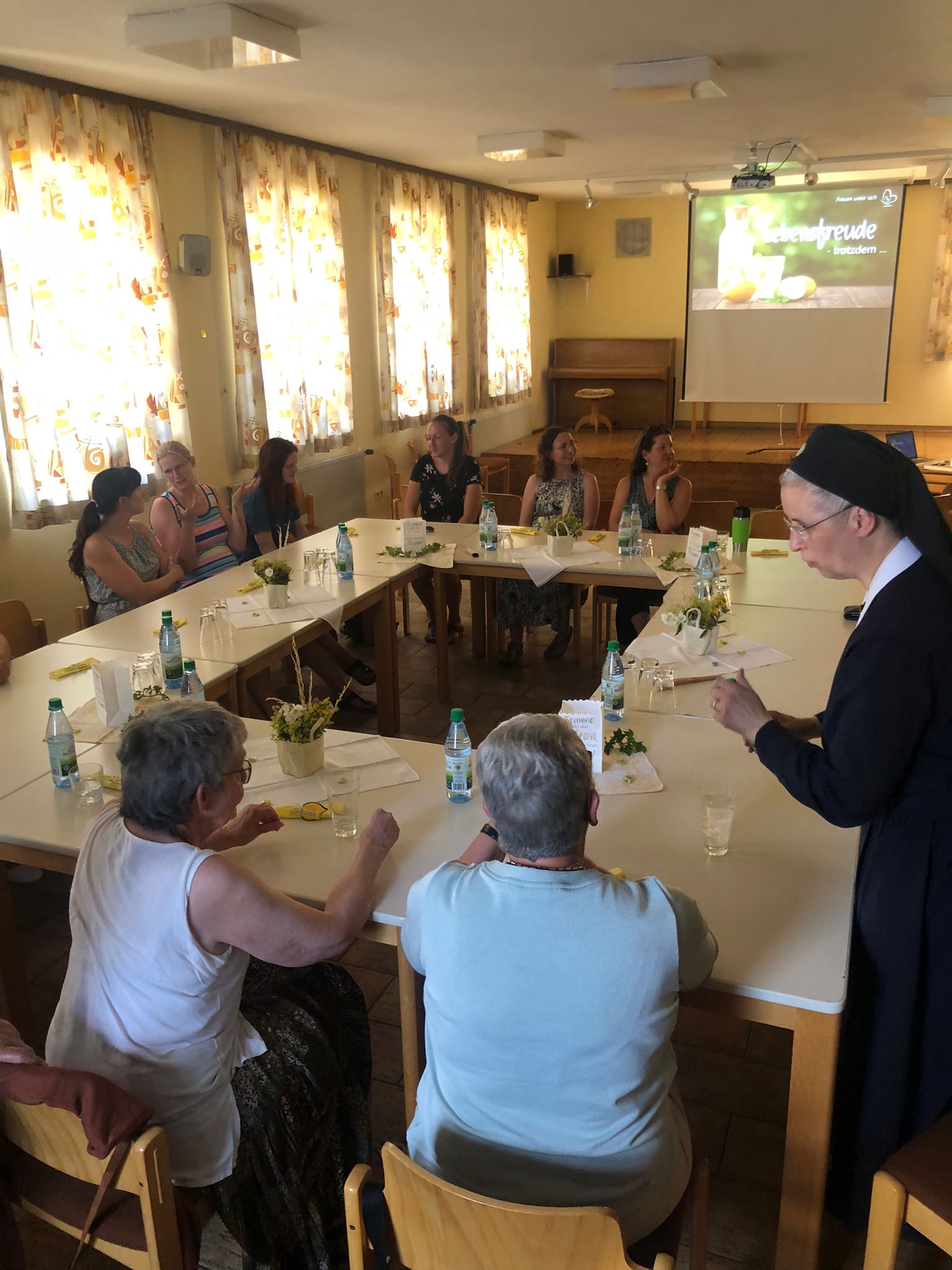 Dazu machten sie sich auf den Weg ins Pfarrheim Schondra und wurden von Schwester Renata von der Schönstattbewegung Würzburg und dem Team Ehe und Familie mit einem Willkommensgruß und einem leckeren Buffet begrüßt. Alles stellte die Zitronen in den Mittelpunkt, aus denen auch gleich frische Limonade hergestellt wurde. Nach dem gemeinsamen Imbiss gab Schwester Renata Hilfestellungen an die Hand, die den Alltag bei Rückschlägen, Niederlagen und emotionalen Stresssituationen erleichtern können. Das Vertrauen auf den immer anwesenden und Halt gebenden Gott ist dafür das Fundament, auf das man aufbauen und aus dem man immer wieder Kraft schöpfen kann.