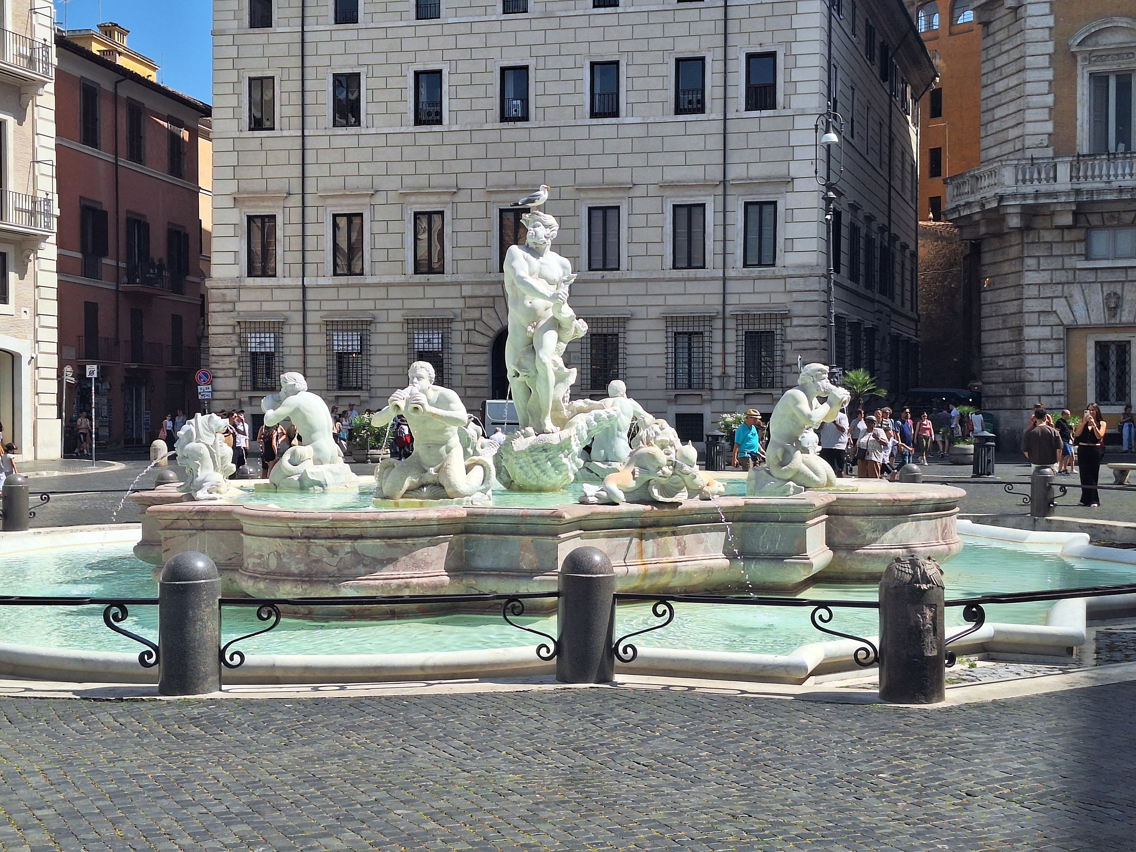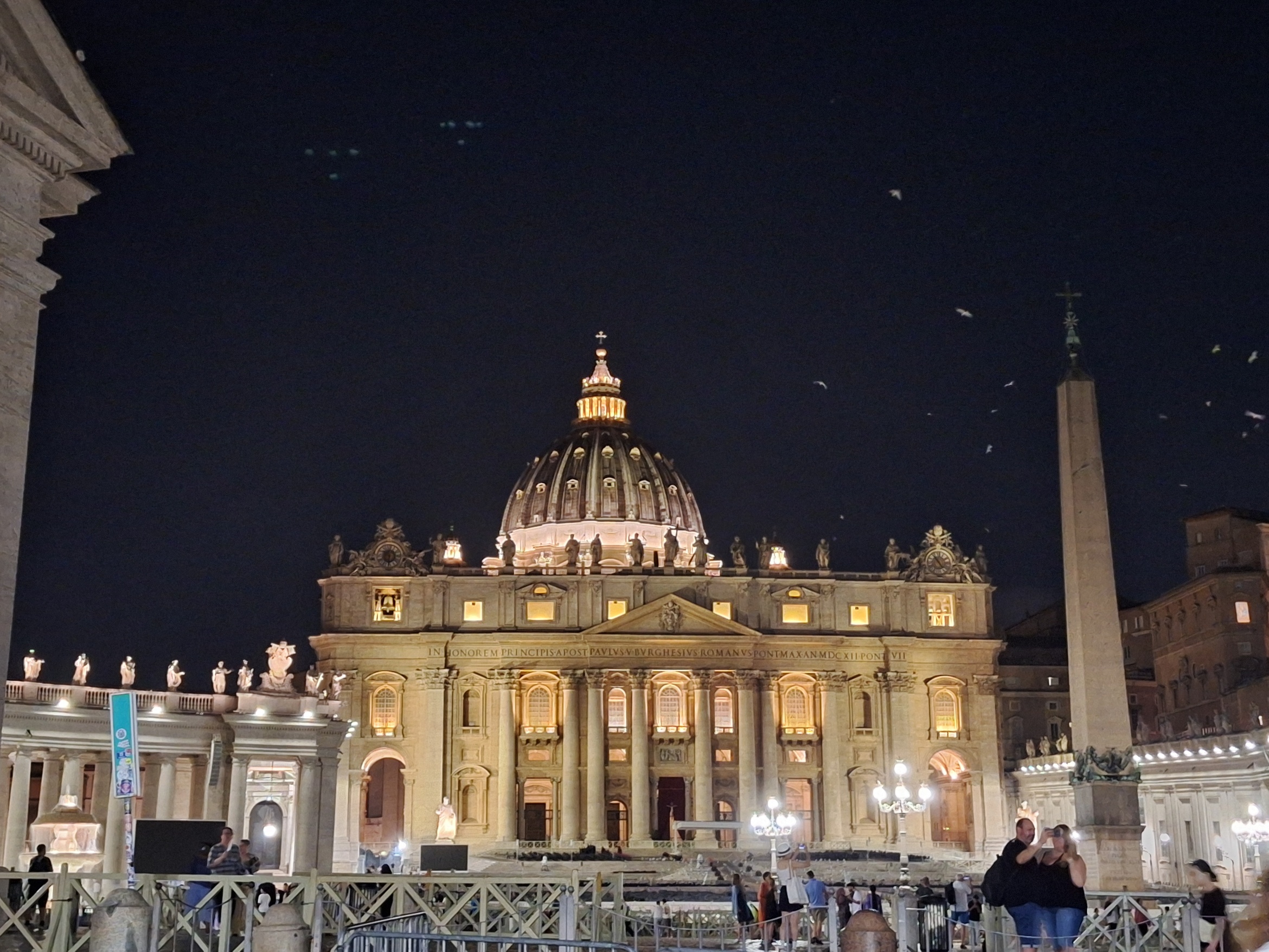 Nach der Pause gingen wir zu der Engelsburg und wurden über die Entstehung und letzte Nutzung des Gebäudes aufgeklärt. Über den Tiber zum Piazza Navona wurde uns über die Geschichten manchen alten Familien von Rom berichtet. Zum Heiligen Jahr hatte man den Platz restauriert und die dazugehörigen Brunnen auch. Über die schmalen und beeindruckenden Gassen von Rom sind wir zur deutschen Gemeinde in Rom gelaufen. Santa Maria dell’Anima liegt im Herzen der römischen Altstadt, sie bietet einen imposanten Kirchenbau und eine reich ausgestattete Sakristei. Dort übte der Chor und das Orchester für den Pfingstgottesdienst am nächsten Tag. Nach dem Genuss der Musik und der Kirchenbetrachtung ging es über die Gassen und Straßen von Rom ins Hotel zurück. Am ersten Abend hatte Claude in der Nähe unseres Hotels ein Restaurant für uns alle organisieren können. Hier wurde gemeinsam italienisch gegessen und getrunken und in allen Augen war die Freude zu sehen. Trotz des langen Tages, machten sich noch einige von der Gruppe auf, den Petersplatz bei Nacht anzuschauen. In aller Stille und fast leer diesen Platz zu erleben, ist wirklich ein Erlebnis!