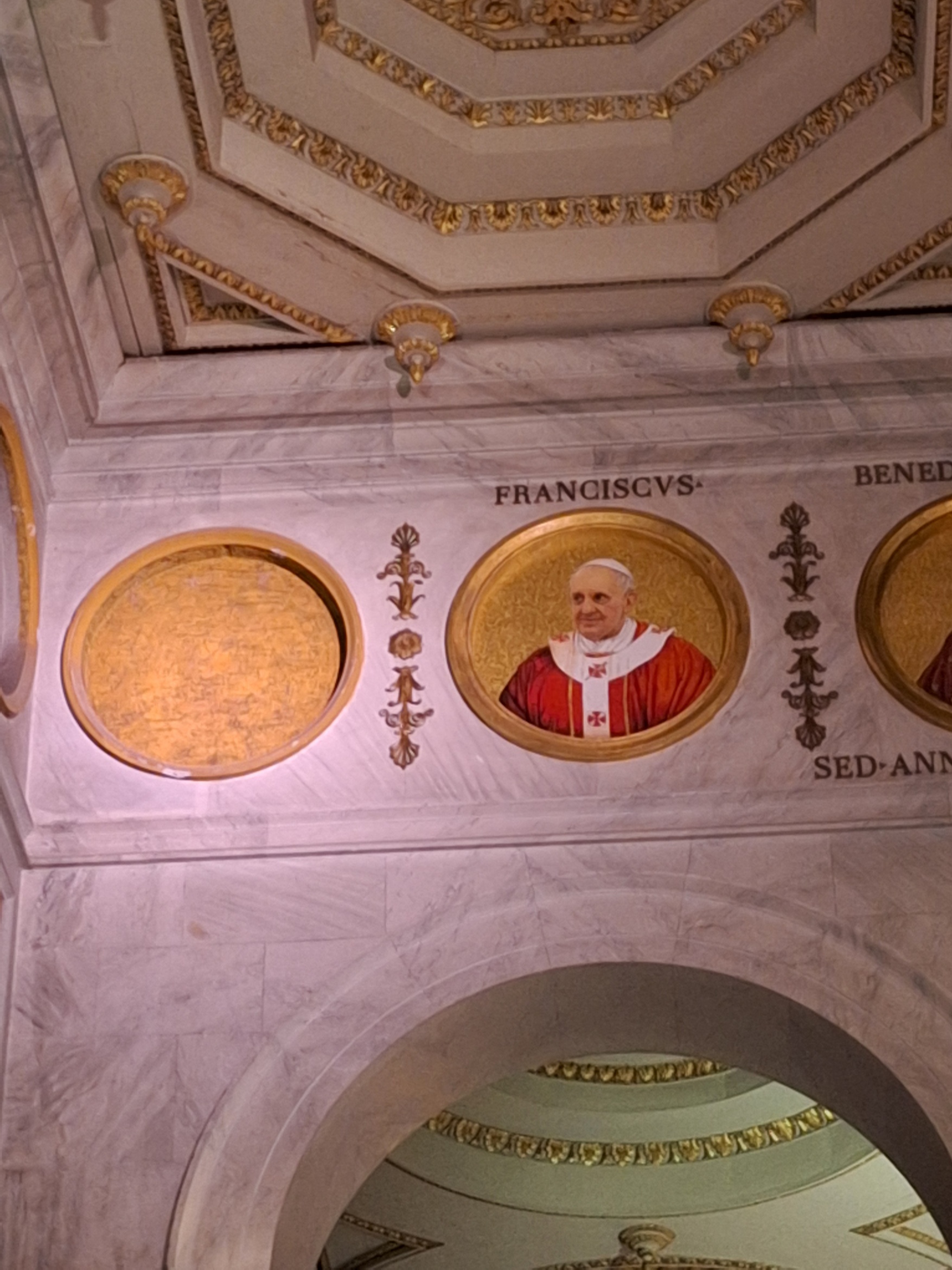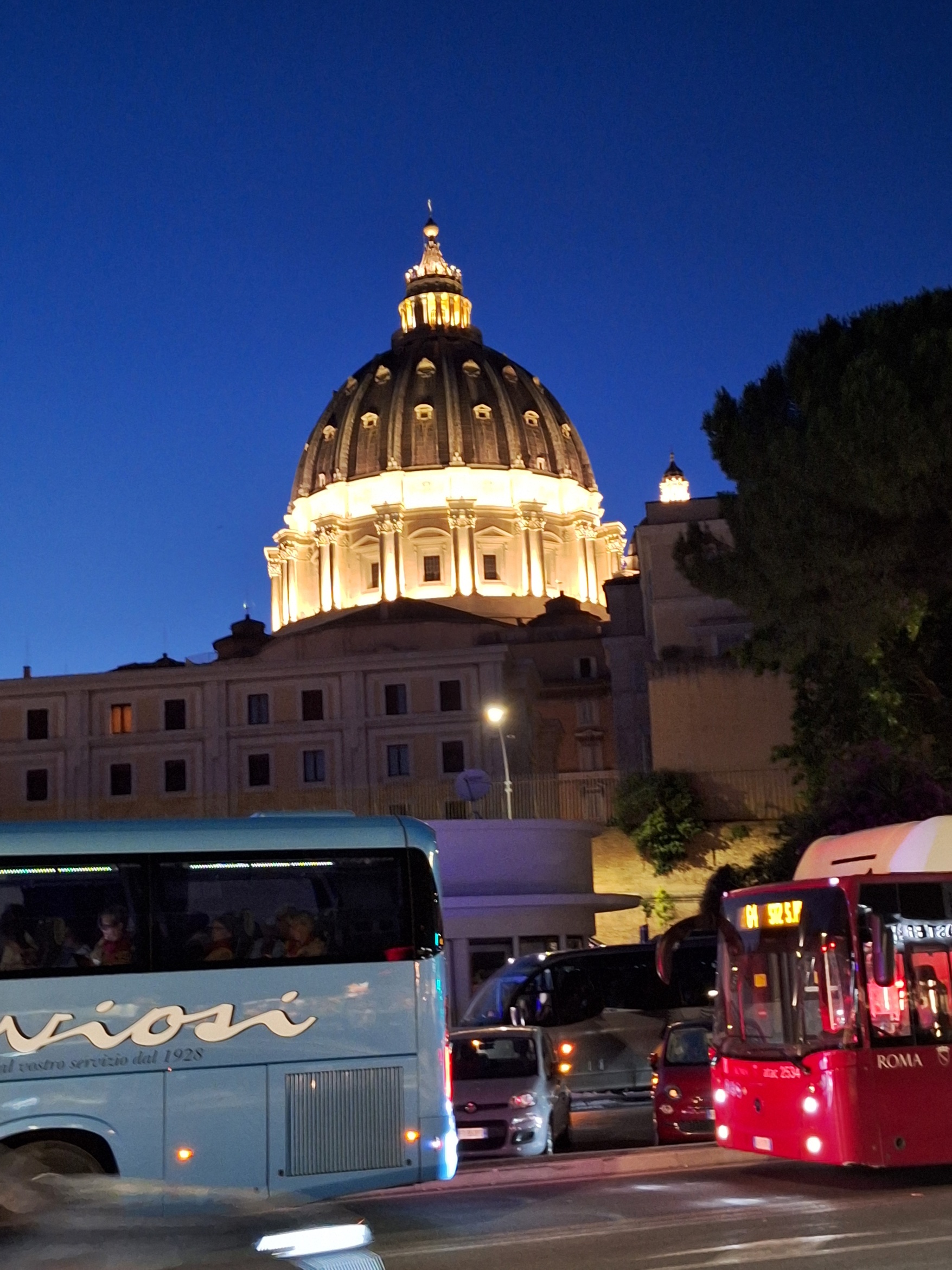 Der Bus fuhr uns nach der italienischen Fiesta aus dem Zentrum Roms und ließ uns an der 3. päpstlichen Basilika an diesem Tag heraus. So standen wir vor der San Paolo fuori le mura (Basilika Sankt Paul vor den Mauern). Sehr beachtliches Bauwerk mit dem Vorgarten und imposanten Mosaiken am Dachgiebel. Da in den Stunden der Fiesta unser Besuch lag, hatten wir zum dritten Mal Glück an diesem Tag und konnten fast ohne Warten auf die dritte Heilige Pforte gehen und jeder ging mit seinen Anliegen und Bitten durch die Heilige Pforte. In dieser Kirche befindet sich das Grab des Völkerapostel Paulus und die Reliquie, die Kette, an dem er gefesselt wurde, ist über seinem Grab im Glasschrein aufgestellt. In dieser Basilika sind alle Päpste in einem Medaillon mit Mosaiksteinen an der Decke abgebildet. Bei Papst Leo XIV ist nur ein beleuchtet leeres Medaillon zu sehen. Nachdem wir an diesem Tag drei heilige Pforten durchschritten haben, war bei allen die Luft raus und so fuhr uns der Bus zum Hotel zurück und jeder durfte den Abend frei genießen.