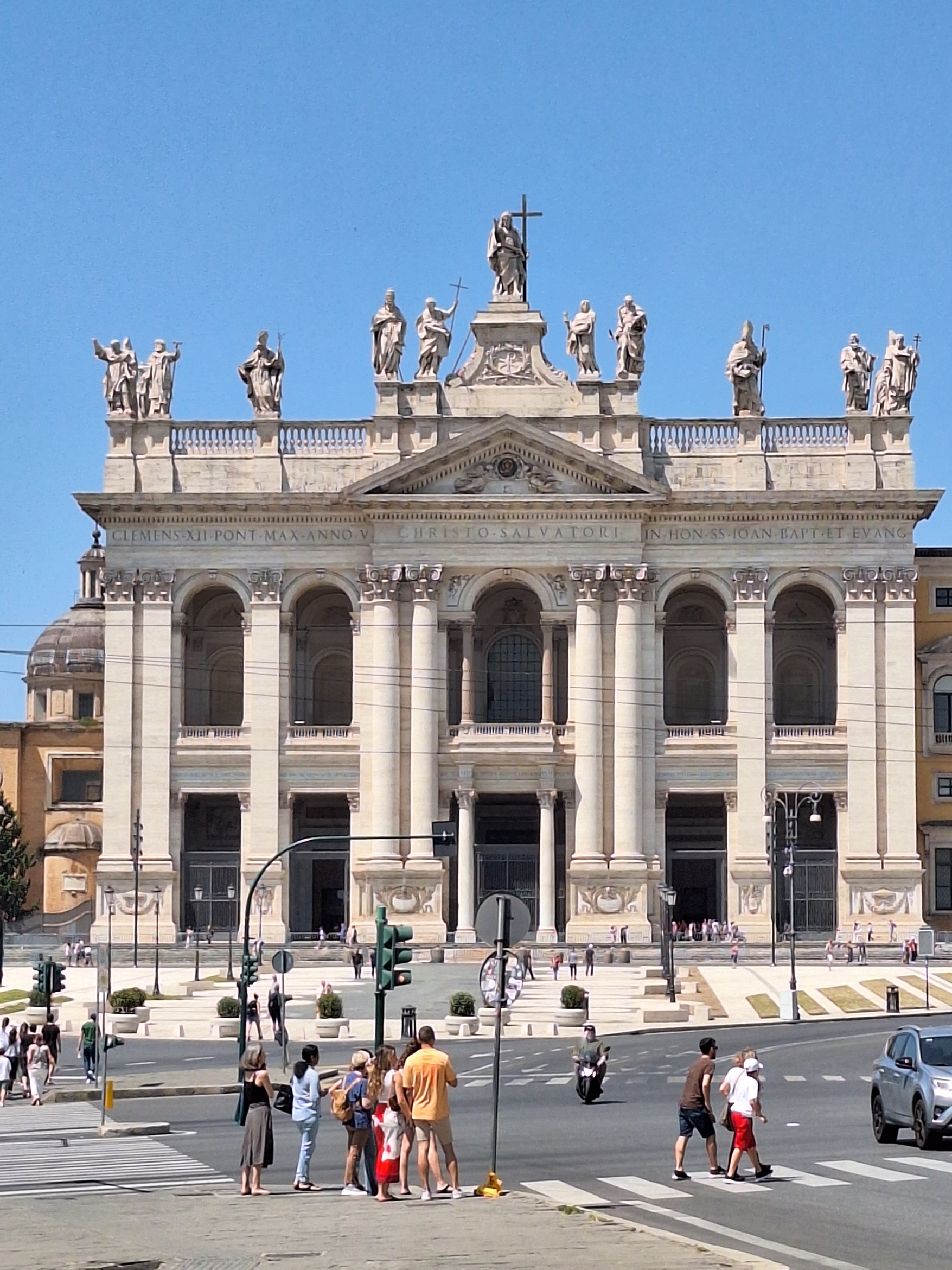 Nach der Besichtigung ging es wieder zum Bus, der uns an diesem Tag zur Verfügung stand, zur der Basilica San Giovanni in Laterano. Sie ist die Bischofskirche von Rom und daher ist sie die ranghöchste der vier päpstlichen Basiliken von Rom. Bevor wir in diese Basilika gingen, nutzten wir die Gelegenheit, die heilige Stiege zu betrachten. Die "Heilige Stiege" (italienisch: Scala Santa) in Rom ist eine Treppe, die der Überlieferung nach die Stufen sind, die Jesus vor seiner Verurteilung im Palast von Pontius Pilatus hinaufstieg. Die 28 Stufen aus libanesischem Marmor befinden sich in einem Gebäude in der Nähe der Lateranbasilika und werden von Pilgern kniend bestiegen, oft begleitet von Gebeten. Auch an der Lateranbasilika hatten wir das Glück, dass nur eine kleine Schlange zum Warten für die Heilige Pforte anstand. In aller Stille und im Gebet konnte die Gruppe die Heilige Pforte durchschreiten. In dieser Kirche sind alle 12 Apostel in imposanter Größe dargestellt. Über das Portal der Sakristei ist der Sarkophag von Papst Leo XIII zu sehen. Danach legten wir eine Mittagspause ein. Die Gruppe verteilte sich in den verschiedenen Restaurants und Tavernen und genoss die Pause.