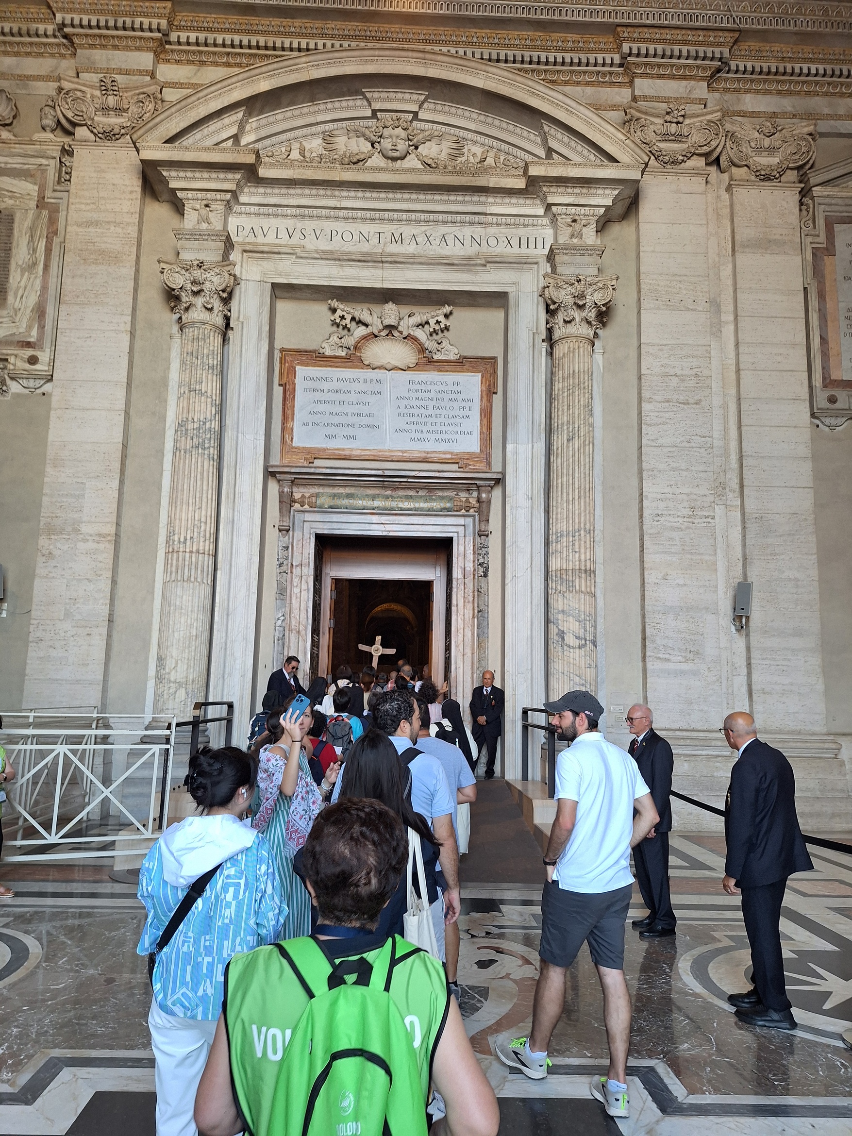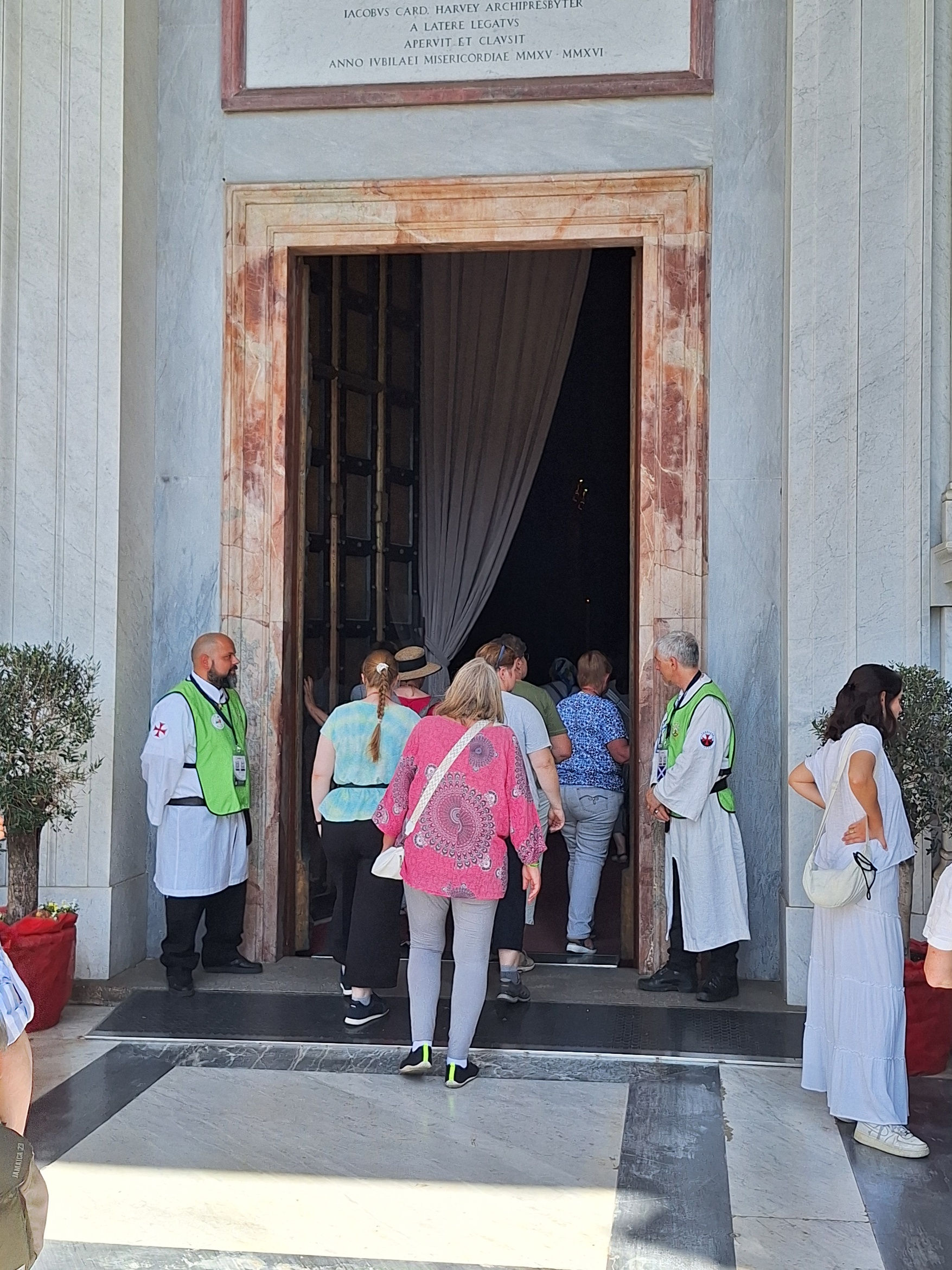Am nächsten Tag ging es zu Fuß zum historischen Rom. Durch römische Gassen führte Claude uns zum Piazza Navona, dort übernahm Christel, die seit über 30 Jahren in Rom lebt und gebürtige Deutsche ist, unserer Gruppe. Sie erklärte die Geschichte und die Bedeutung der Brunnen auf dem Platz. Kaum betritt man diesen barocken Traum im Zentrum Roms, fühlt man sich wie in eine andere Zeit versetzt. Die lebendige Atmosphäre, die historischen Gebäude und der Klang des plätschernden Wassers aus den drei prachtvollen Brunnen schaffen eine ganz besondere Magie. Von dort ging es wieder durch die kleinen Gassen zum Platz, an dem der alte Tempel Pantheon steht. Leider kostet es seit dem 1.1.`25 Eintritt, außerhalb der Gottesdienstzeit. Da eine riesige Warteschlange anstand, entschlossen wir uns, nach einer Erklärung weiter zu gehen. Auf dem Weg zum Trevi-Brunnen besuchten wir die Kirche Sant’ Ignazio. Sie liegt etwas verborgen in den Gassen. Wenn man darin ist, wird man mit einer beeindrukenden Deckenfresken von Andrea Pozzo über das Thema des Mittelschiffs die Verehrung des hl. Ignatius, überrascht. Je näher man dem Trevi-Brunnen kommt, wird die Menschenmenge größer und es wird immer lauter. Da wir an einem Montag da waren, war der Brunnen wegen Reinigungsarbeit und Entnahme der Münzen außer Betrieb. Schade, dass so viel sprichwörtlich Münzenwerfen ins Wasser fällt. Das Geld kommt nämlich der römischen Caritas zugute. Durch weitere Gassen führte Christel uns zum Piazza Mignanelli. Dort steht auf einer hohen Säule eine Muttergottes. Sie wird als unbefleckte Empfängnis dargestellt. Am 8. Dezember kommt der Papst und betet an der Säule zur Muttergottes. Anschließend wird ein großer Blumenkranz durch die Feuerwehr der Stadt Rom um den Arm der Muttergottes gelegt. An der Spanischen Treppe wurde wieder ein Gruppenbild aufgenommen. Damit unsere Pilgergruppe die Erfahrung der Metro genießen konnte und zur Entlastung unserer Füße, nahmen wir zum Petersplatz die Metro. In der Nähe der Metro Haltestelle verteilte sich die Gruppe in verschiedene Restaurants. Nachdem wir die Pause genossen haben, ging es zum ersten Höhepunkt unserer Wallfahrt. Unsere Pilgergruppe holte sich für das Durchschreiten der Heiligen Pforte Petersdom im Pilgerbüro an der Via della Concilizione ein Pilgerkreuz. Unser 2. Jüngster trug das Kreuz und ich führte die Pilgergruppe an. So gingen wir betend und singend den Weg zur der Heiligen Pforte Petersdom. Als Pilgergruppe hatten wir das Privileg, eine eigene Kontrolle zu haben, um ohne große Wartezeit zur Pforte zu kommen und bis zum Grab des Hl. Apostel Petrus zu gehen. In der Nähe des Grabes beteten wir das apostolische Glaubensbekenntnis, mit dem Segen des Pilgerkreuzes endete unser Wallfahrtsweg zur Heiligen Pforte.