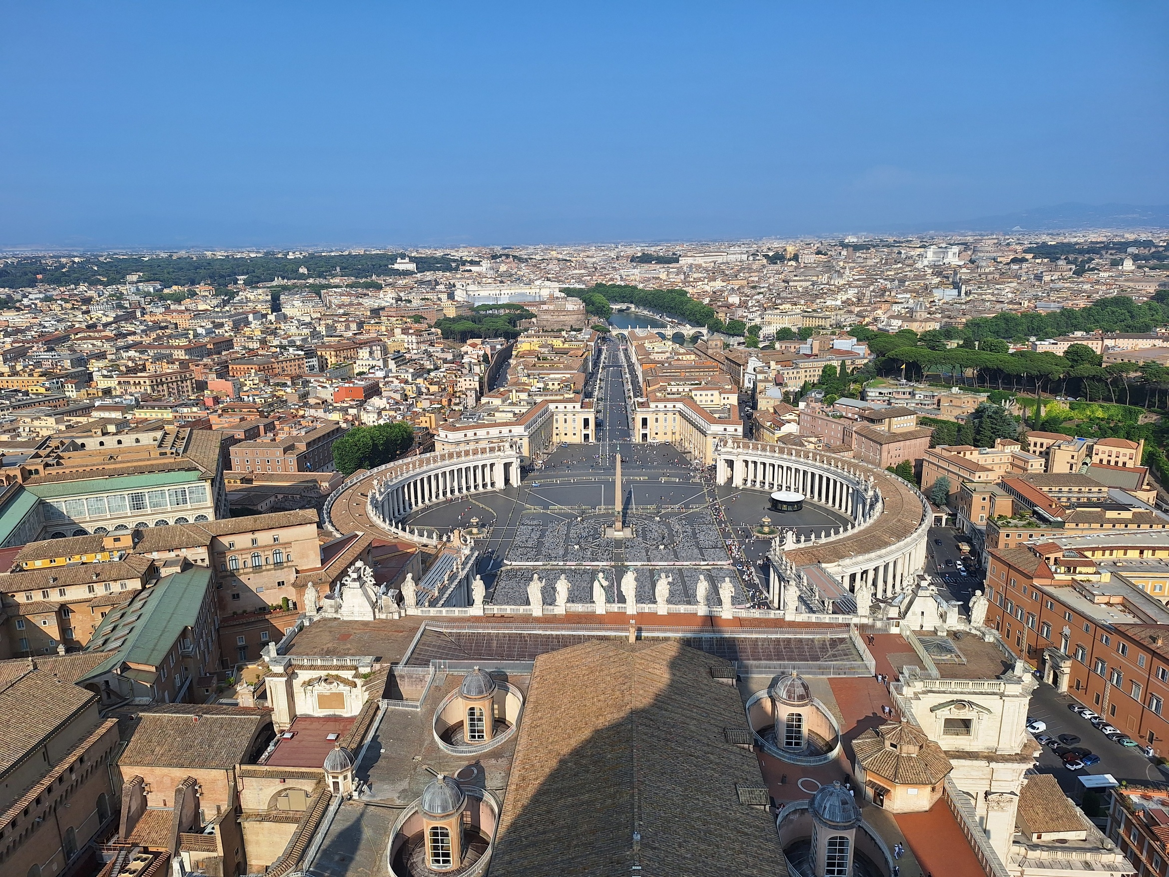 Danach konnte jeder sich entscheiden, im Petersdom zu verweilen oder auf die Kuppel zu gehen. Ein Teil entschloss sich für die Kuppel. Der Aufzug half uns in die Höhe, aber es war trotzdem noch anstrengend, die letzten Stufen zu laufen, gefühlt waren es noch tausend. (von Petersdom bis zur Kuppel sind es tatsächlich 551 Stufen) Von dort genossen wir die Aussicht über Rom, entdeckten unser Hotel, den Weg, den wir schon gegangen an diesem Tag sind. Der Tag endete wieder einmal in verschiedenen Restaurants.