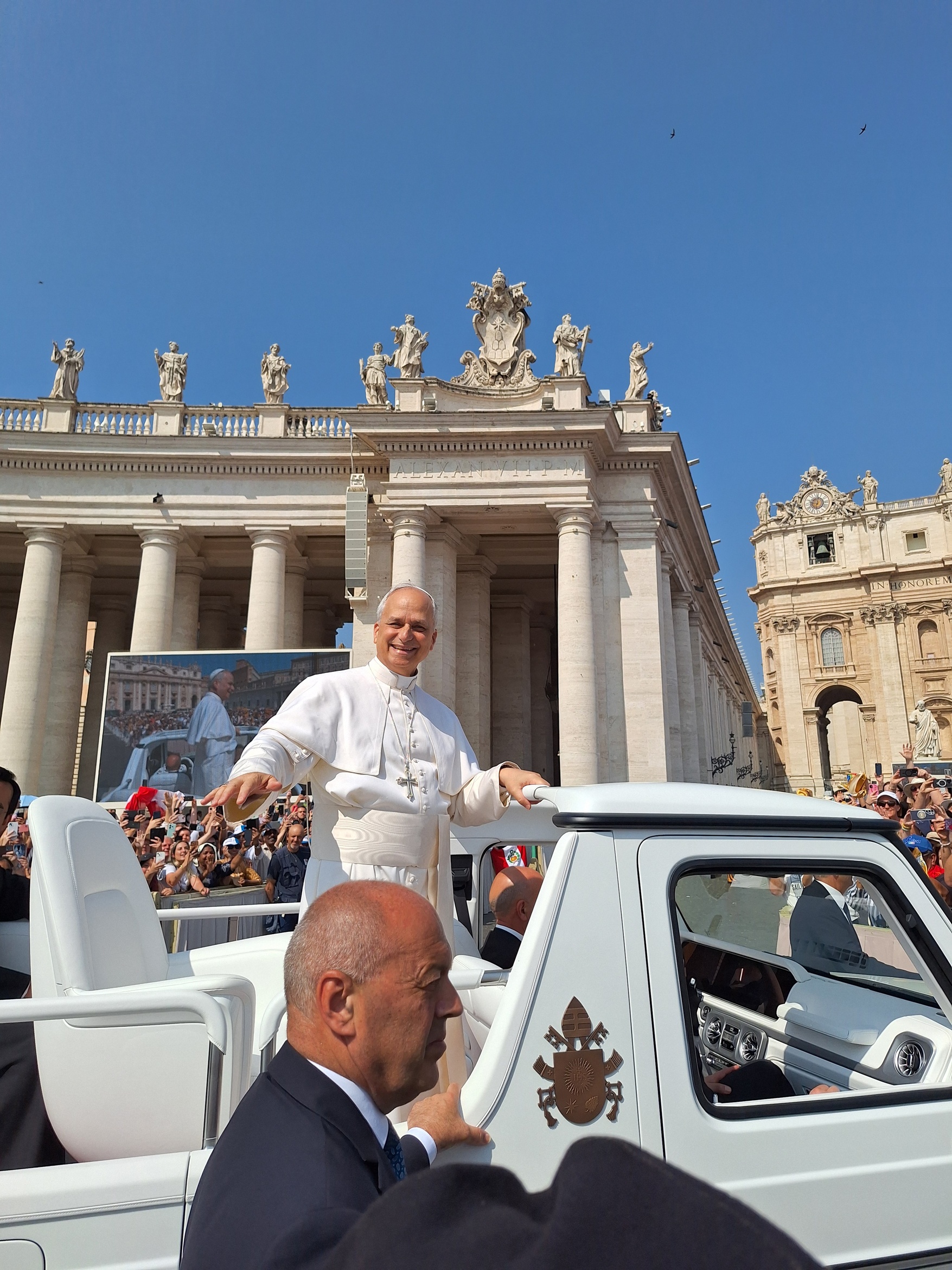 Am letzten Tag sollte uns die Begegnung mit Papst Leo XIV bevorstehen, deshalb machten wir uns sehr früh auf zum Petersplatz, denn es wurden ca. 45.000 Besucher für die Generalaudienz erwartet (i.d.R. sind es 5 bis 6 Tausend Menschen). Da unsere Gruppe aufgeteilt wurde, hatten wir für alle einen guten Platz gefunden. Kurz vor 10.00 Uhr fuhr Papst Leo XIV auf dem Petersplatz mit Jubel und "Papa Leon" wurde von den zahllosen Besuchern herzlich und euphorisch begrüßt. Enttäuschend für unser Elternpaar, mit ihrem kleinen Sohn fuhr der Papst einfach vorbei. Der Schweizer Gardist tröstete uns, Papst Leo XIV kommt noch einmal an dieser Stelle vorbei. Voller Erwartung, dass Papst Leo XIV unseren jüngsten Pilger persönlich segnet, warteten wir auf die zweite Gelegenheit. Tatsächlich nahm unser neuer Papst Leo XIV E. in seine Hände und segnete ihn persönlich. Anschließend schaute er nach seinen Eltern und segnete sie auch und blickte freundlich in meine Kamera. Welch ein unvergessliches Erlebnis für unsere Pilgergruppe! Während der Audienz hat Papst Leo XIV unsere Andachtsgegenstände auch gesegnet. Nach der Audienz besuchten wir noch den deutschen Friedhof im Vatikan. Auf dem Weg zum Hotel wurde die letzte Gelegenheit genutzt, um Souvenirs für die Lieben zu Hause zu kaufen. Mit dem letzten Mittagessen in Rom haben wir die Tage in Rom beendet. Spätnachmittag ging unser Flieger wieder nach Frankfurt, dort holte uns der Bus ab und brachte uns wieder nach Bad Brückenau.