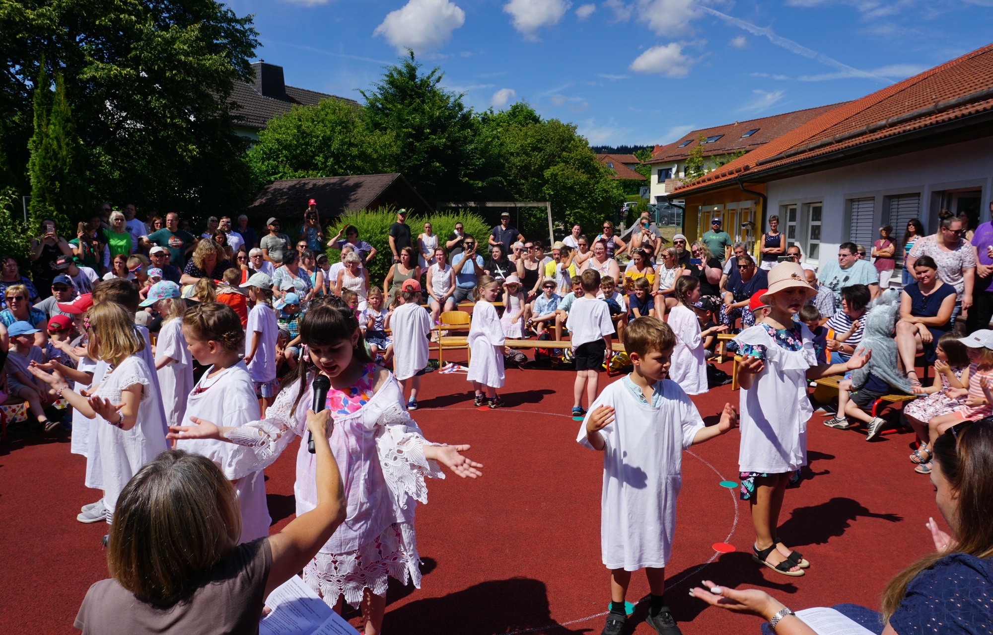 Wer St. Martin, das Christkind und den Osterhasen im Hochsommer erleben wollte, konnte das am Sonntag beim Kindergartenfest zum 30-jährigen Jubiläum in Wildflecken tun. Passend zum Jahresthema „Ein ganzes Jahr und noch viel mehr“ führten die Kindergartenkinder die Eltern, Großeltern und Gäste zu Beginn des Sommerfestes mit Liedern, Tänzen und Kreisspielen durch ein Kindergartenjahr.
