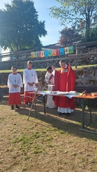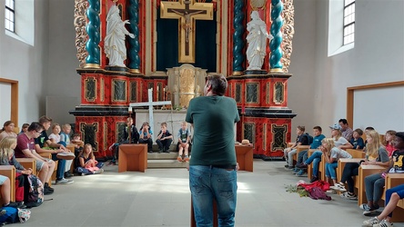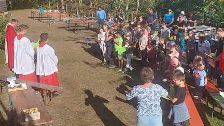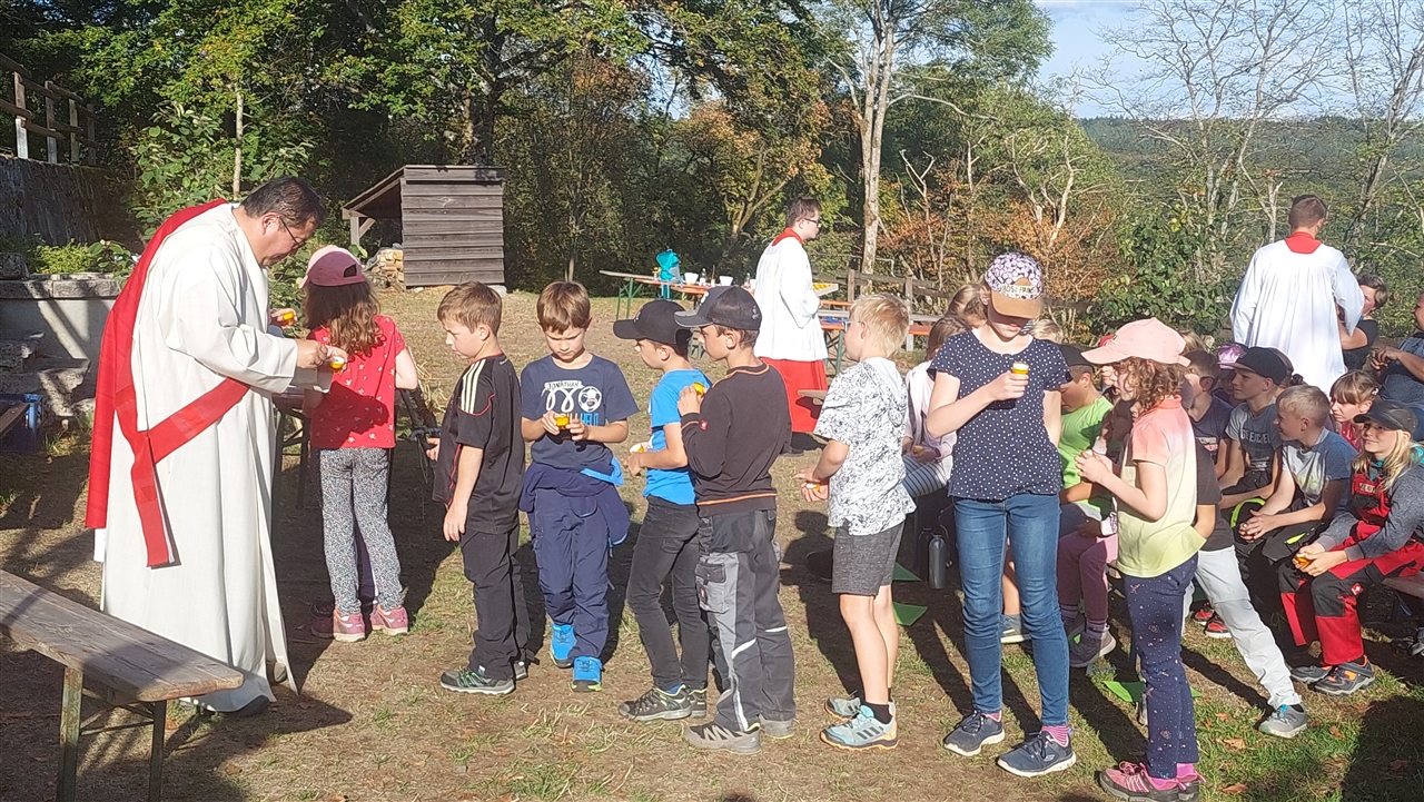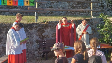 Zum abschließenden Gottesdienst in den Terrassengärten mit Kaplan Thomas Elbert kamen rund 20 Eltern dazu. Elbert ist schon seit vielen Jahren am Volkersberg ehrenamtlich in der Kinder- und Jugendarbeit aktiv und wurde vor wenigen Monaten an Pfingsten zum Priester geweiht. Im Mittelpunkt des Gottesdienstes stand die alte Volkersberger Wallfahrtstradition Sorgen, Anliegen und Nöte vor das heilige Kreuz zu bringen und so gestärkt in den Alltag zurückzukehren. Um dies für die jungen Pilger erfahrbar zu machen, durften alle eine Kerze entzünden. Die Kinder und Jugendlichen folgten also den Spuren der Pilger und Wallfahrer früherer Zeiten und füllten diese mit neuem Leben: Auch sie kamen zu Fuß, erlebten einen ereignisreichen Tag und konnten nochmal Kraft tanken, bevor am nächsten Tag das neue Schuljahr startete.