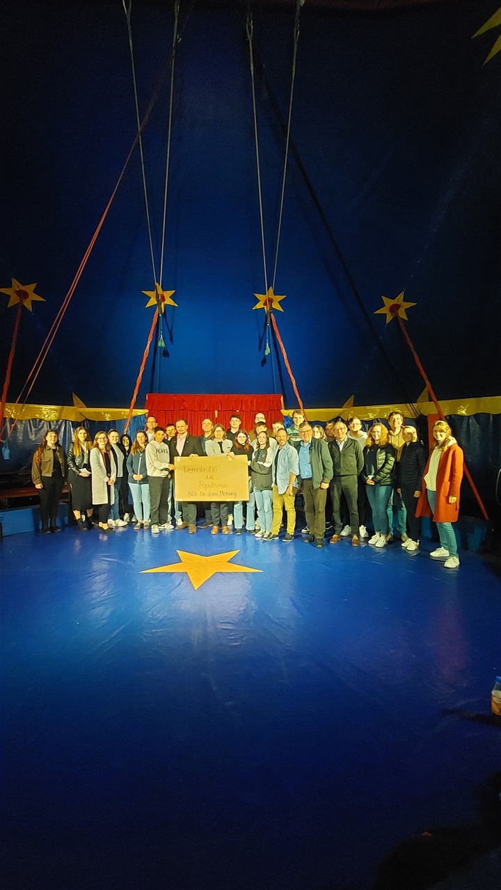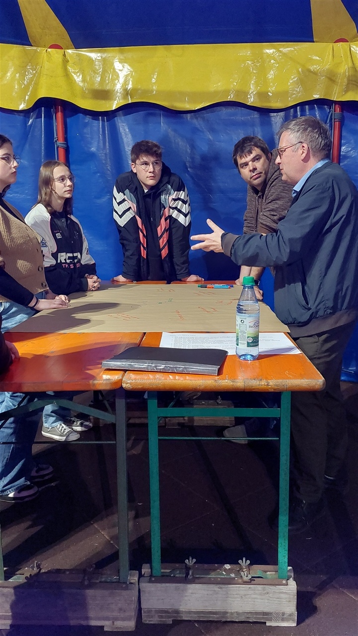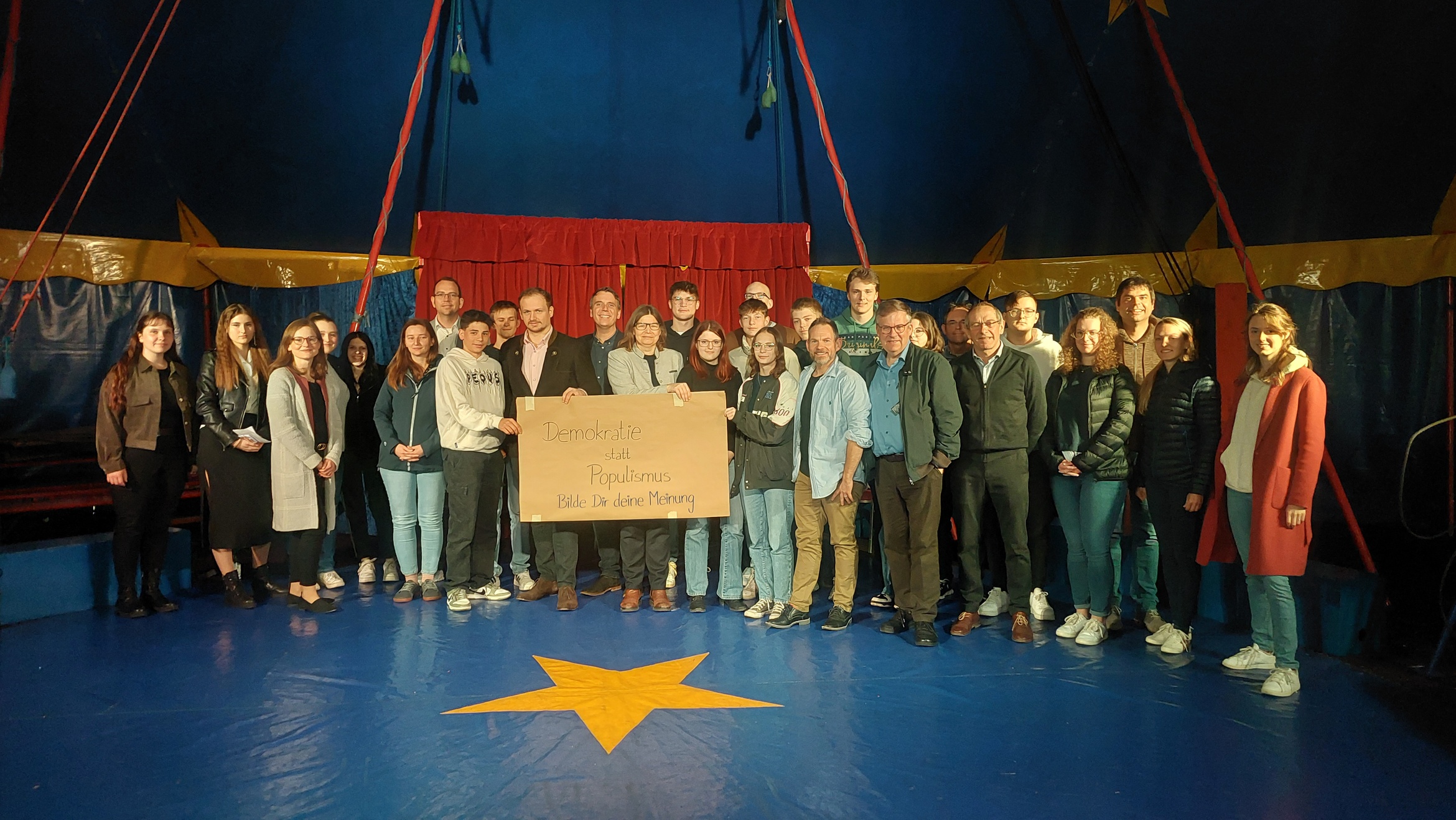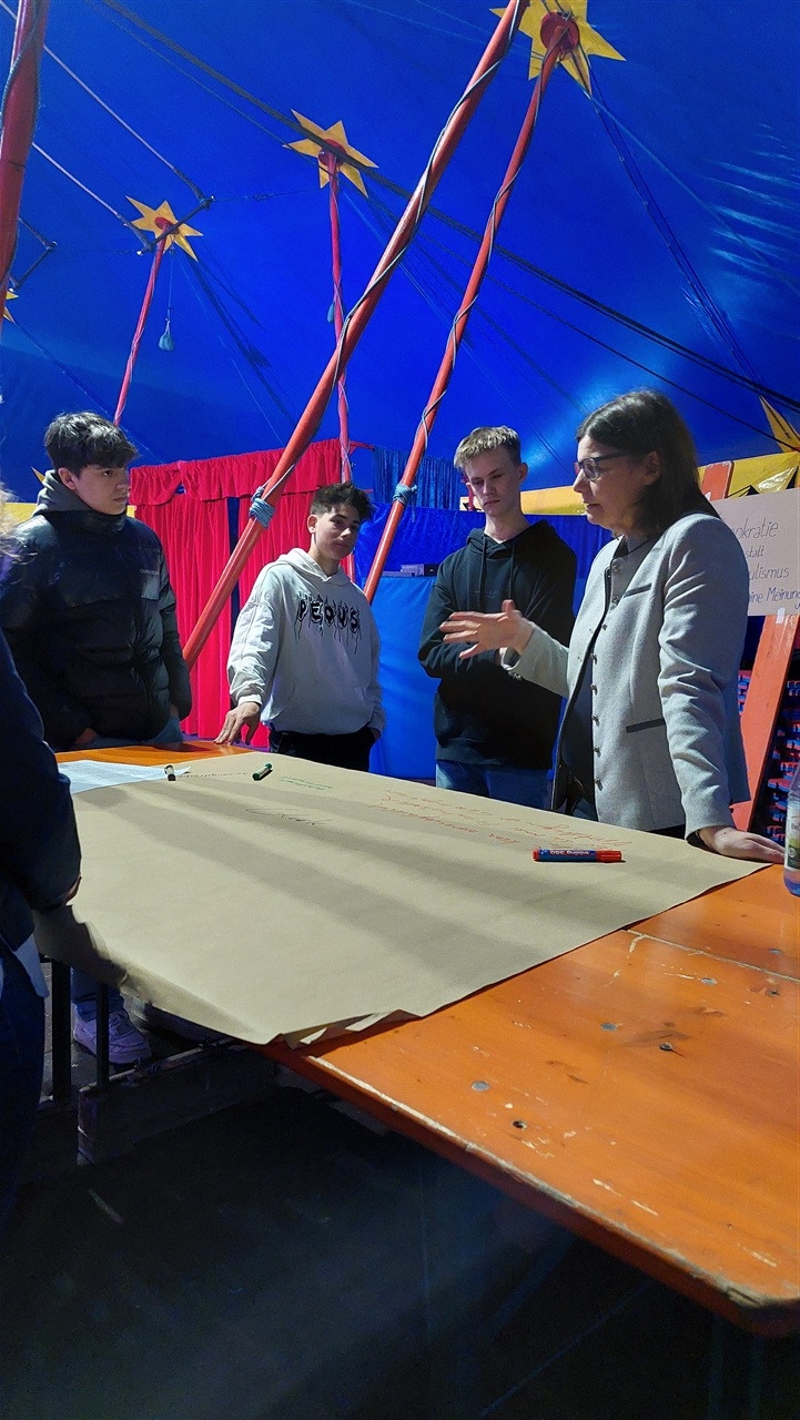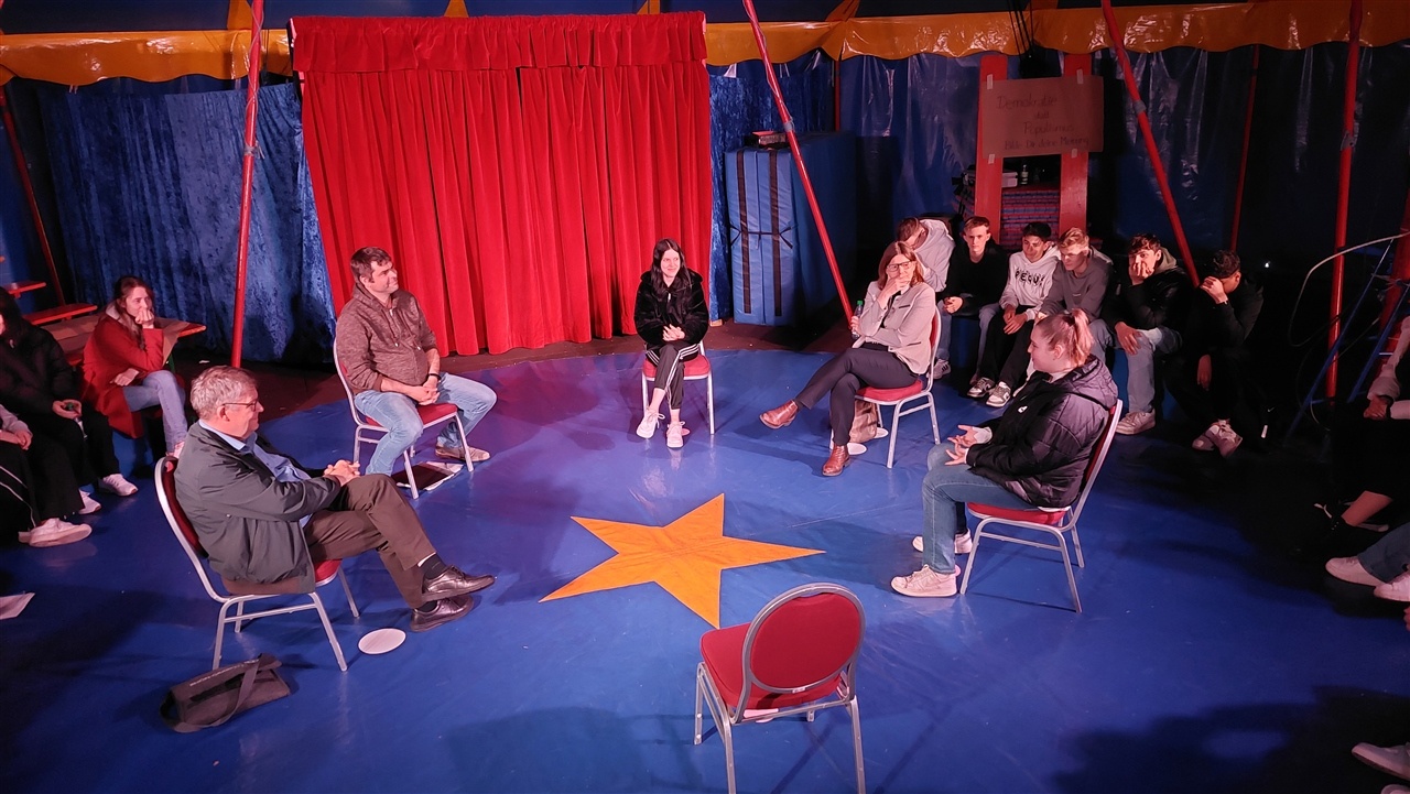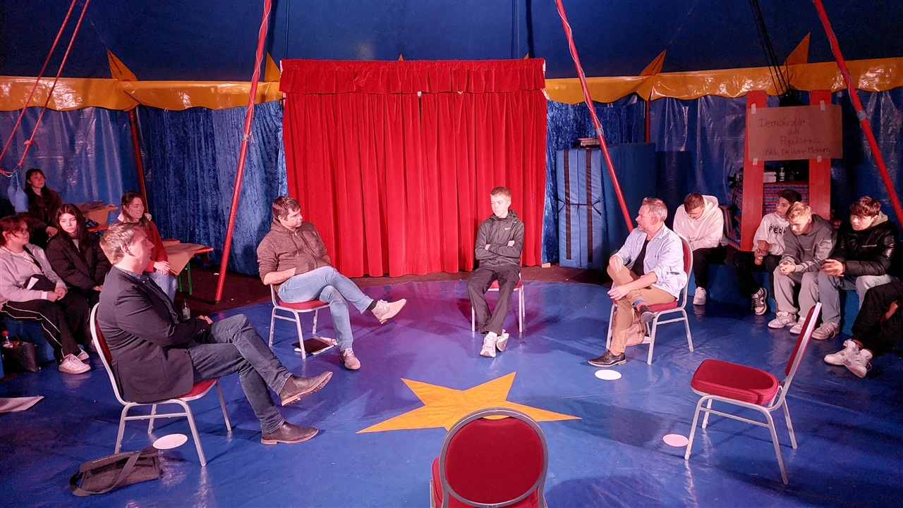 Die ehemalige Schülerin des Bad Brückenauer Gymnasiums Maya Morper startete mit einem interaktiven Impuls zur Wirkweise von Populismus. Danach diskutierten die Jugendlichen mit aktiven Politikern zu den Themen Europa, Gesellschaft, Umweltschutz, Politik und Glück. Hierzu sind die Bundestagsabgeordnete Dr. Manuela Rottmann (Bündnis90/dieGrünen), der Landtagsabgeordnete Volkmar Halbleib (SPD), die Kreisräte Christof Herbert (CSU) und Frank Helmerich (Freie Wähle) sowie Max Hümmer (FDP) ins Zirkuszelt auf dem Volkersberg gekommen. Den Abschluss des Nachmittages bildete eine Gesprächsrunde im Plenum, bei der die Schüler auch noch einmal ganz persönliche Fragen an die Politiker stellen konnten.