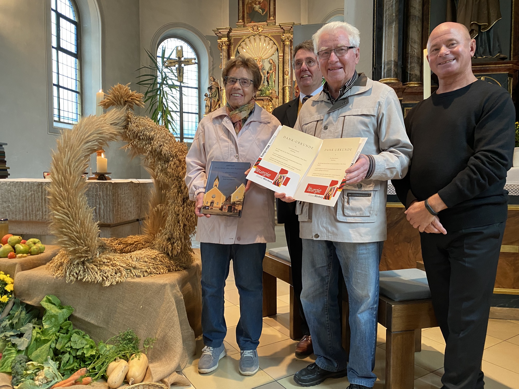 Am Erntedank-Sonntag wurden Friedrich und Blanka Schumm für über 50 Jahre aktiver Mitarbeit in der katholischen Kirche geehrt. Dazu überreichte Pastoralreferent Hopf dem Ehepaar die bischöflichen Dank-Urkunden.