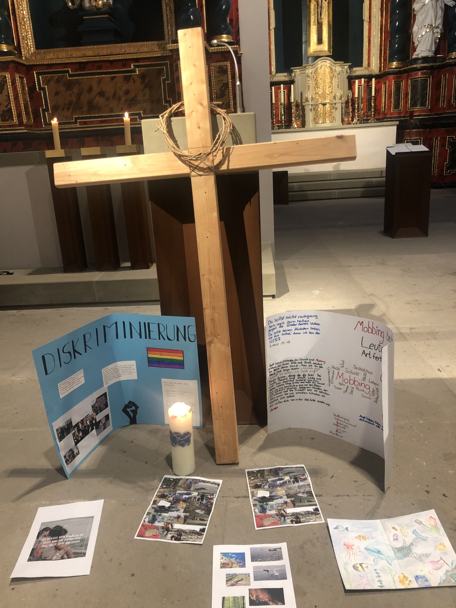 In selbst zusammengestellten Stationen wurden Lebenssituationen zu den Stichworten Mobbing, Armut, Krieg & Terror, Diskriminierung, Krankheit, Schulstress, Schöpfung & Umweltschutz, Tod & Trauer beleuchtet. Dazu hatten die Firmlinge sich bereits im Vorfeld in Gruppen zusammengefunden. Beeindruckend war die Auswahl von Bibelworten und Gebet, dazu gestellt moderne Lieder und erstellte Collagen bis hin zu selbst kreierten Bildern. All das wurde vor das Kreuz gelegt als Leiden der heutigen Welt und damit in die Hoffnung der Auferstehung und Wandlung zu verändertem neuen Leben hineingenommen.