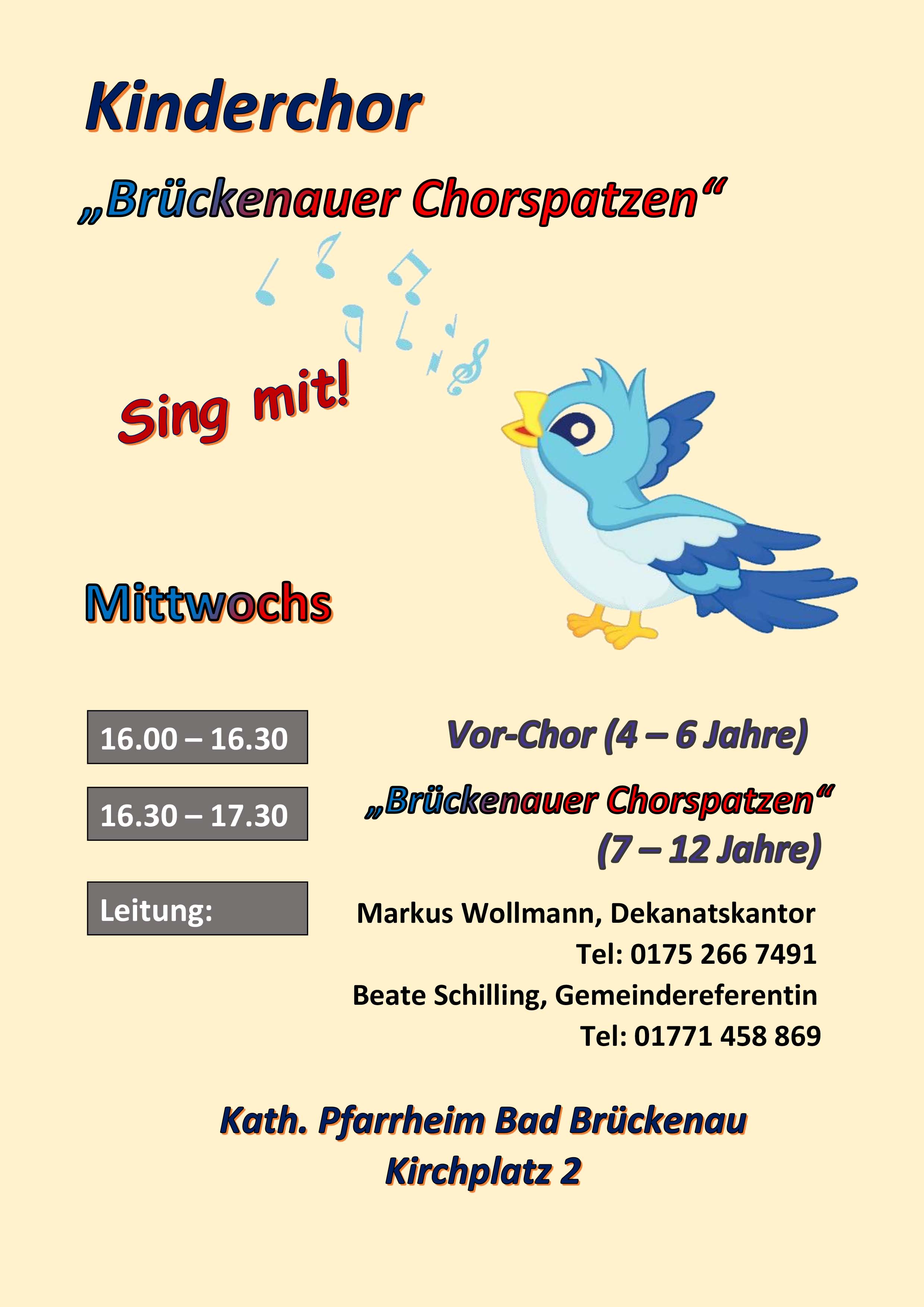 Am Mittwoch, 23.11.2022 findet die erste Chorprobe des neuen Kinderchors "Bad Brückenauer Chorspatzen" im Pfarrheim in Bad Brückenau statt.