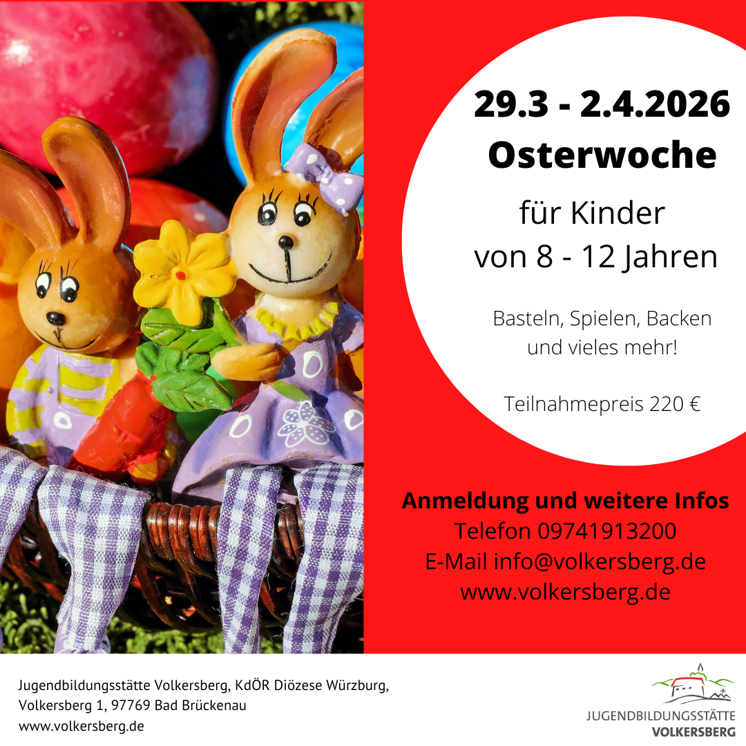 Die Jugendbildungsstätte Volkersberg lädt Kinder im Alter von 8-12 Jahren vom 29.3 - 2.4.2026 zu Ostertagen auf den Volkersberg ein. Neben kreativen Basteleien, spannenden Geschichten, süßen Leckereien und lustigen Spielen wird auch viel Zeit in der Natur verbracht. Im Teilnahmepreis von 220 € sind die Übernachtung, Vollverpflegung, pädagogische Betreuung und das Arbeitsmaterial enthalten.