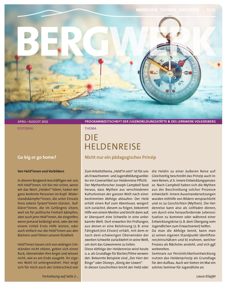 Im inhaltlichen Teil steht das Thema Helden im Mittelpunkt. Die Betrachtungen gehen von dem pädagogischen Wirkungsprinzip einer Heldenreise über die Unterscheidung von Helden und Vorbildern bis hin zur Frage, ob das Christentum eine Religion für Helden ist. Im Interview berichtet der ehemalige CDU Generalssekretär Peter Tauber von seiner Erkenntnis "Du musst kein Held sein" und lädt zur Autorenlesung seines gleichnamigen Buches am 5.5.2022 auf dem Volkersberg ein.