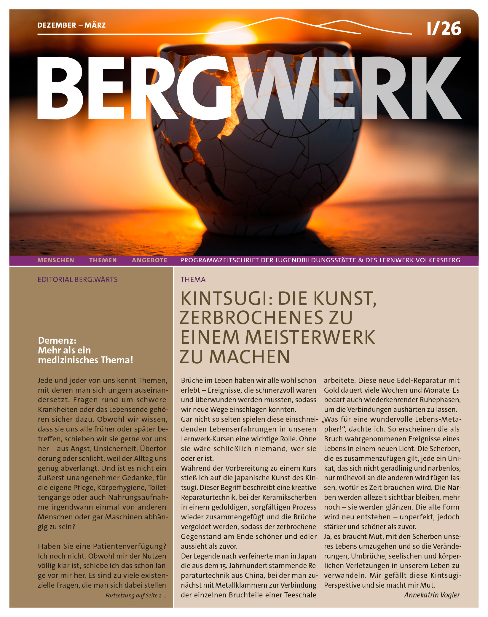 Die neue Ausgabe der Programmzeitschrift Bergwerk der Jugendbildungsstätte und des Lernwerks Volkersberg ist erschienen. Im inhaltlichen Teil steht die Krankheit Demenz im Mittelpunkt. Die Betrachtungen gehen von Demenzspaziergängen in der Natur und der Herausforderung für Angehörige bis hin zur Erkenntnis, dass Demenz weit mehr ist, als nur ein medizinisches Thema. Im Interview spricht sich Dr. Sarah Straub für Lebensmut aus und lädt zu ihrer Konzertlesung am 13. März 2026 auf den Volkersberg ein. In der neuen Bergwerkausgabe sind außerdem alle Volkersbergangebote von Weihnachten bis Ostern nächsten Jahres zu finden.