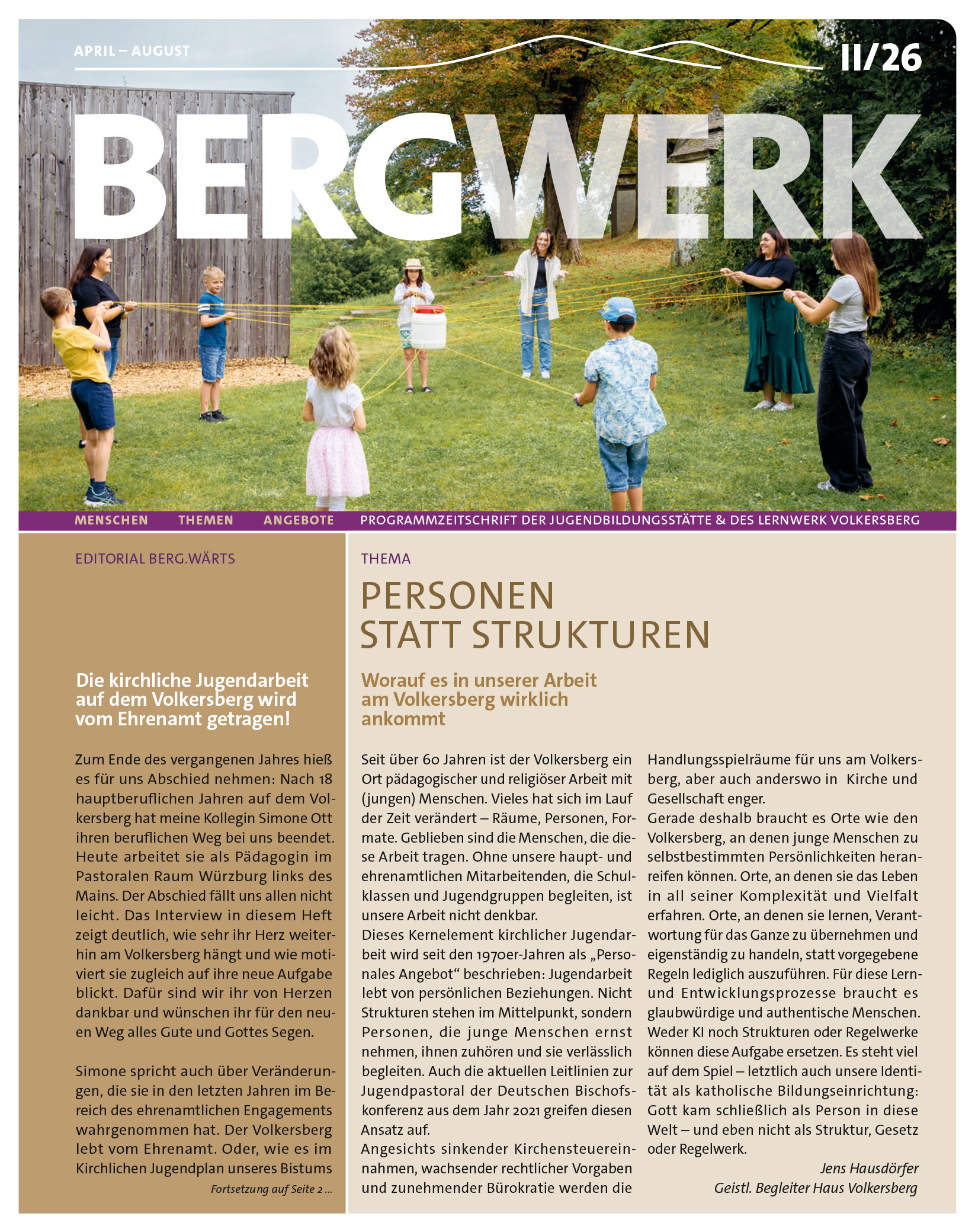 Die neue Ausgabe der Programmzeitschrift Bergwerk der Jugendbildungsstätte und des Lernwerks Volkersberg ist erschienen. Im inhaltlichen Teil steht die kirchliche Jugendarbeit auf dem Volkersberg im Mittelpunkt. Die Betrachtungen gehen vom spirituellen Angebot für Jugendliche über die Arbeit mit Ehrenamtlichen bis hin zum personalen Angebot. Im Interview verabschiedet sich die Jugendbildungsreferentin Simone Ott nach 18 Jahren hauptberuflicher Mitarbeit vom Volkersberg. In der neuen Bergwerkausgabe sind außerdem alle Volkersbergangebote von Ostern bis August zu finden.