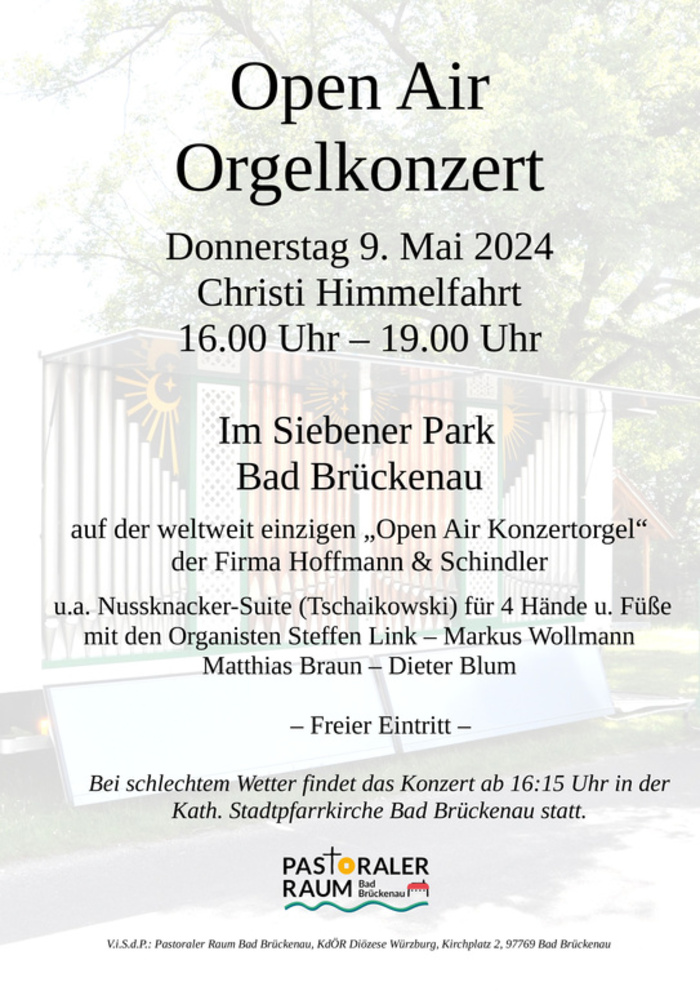 Der Pastorale Raum Bad Brückenau lädt am 9.5.2024 (Christi Himmelfahrt) von 16 – 19 Uhr zum Open-Air-Orgelkonzert in den Siebener Park nach Bad Brückenau ein.